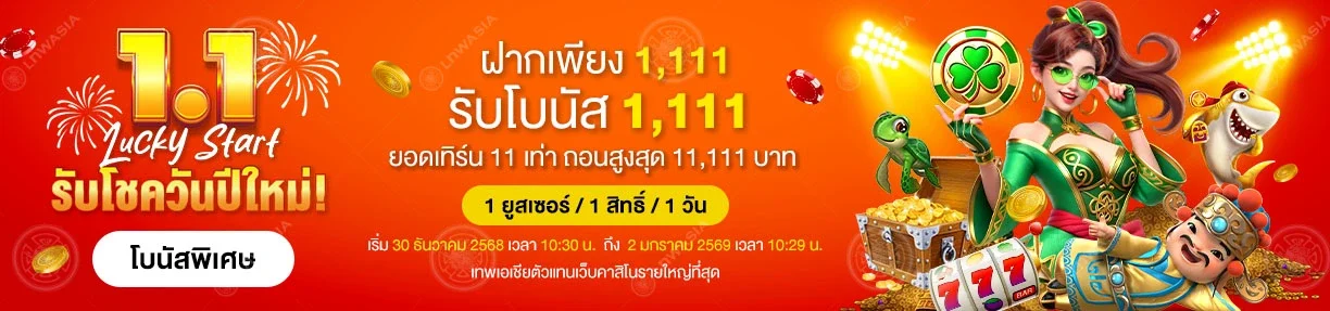 1.1 Lucky Start รับโชควันปีใหม่! ฝากเพียง 1,111 บาท รับโบนัสอีก 1,111 บาท! โบนัสพิเศษมอบให้เฉพาะสมาชิกเทพเอเชีย ยอดเทิร์นโอเวอร์เพียง 11 เท่า ถอนได้สูงสุด 11,111 บาท สมาชิก 1 ยูสเซอร์ รับ 1 สิทธิ์ต่อ 1 วัน เฉพาะเกมสล็อตและยิงปลาจีคลับ